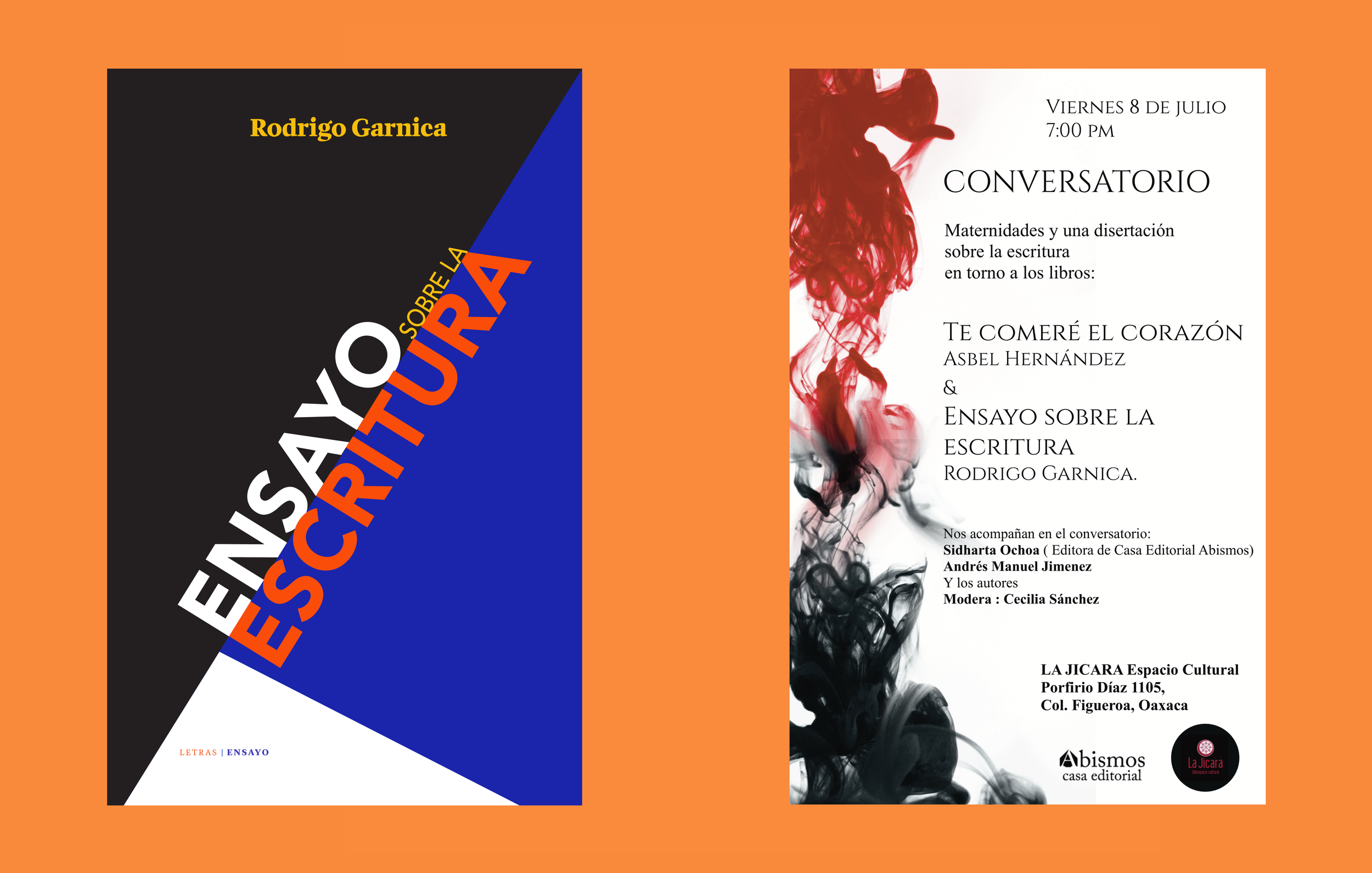 Los invito el Viernes 8 de Julio de 2022 a las 19:00 hrs al conversatorio: maternidades y una disertación sobre la escritura. Ahí se presentará Rodrigo Garnica y Asbel Hernández, en el espacio cultural “La Jícara”, donde los autores hablarán sobre sus libros Ensayo sobre la escritura y Te comeré el corazón, respectivamente.